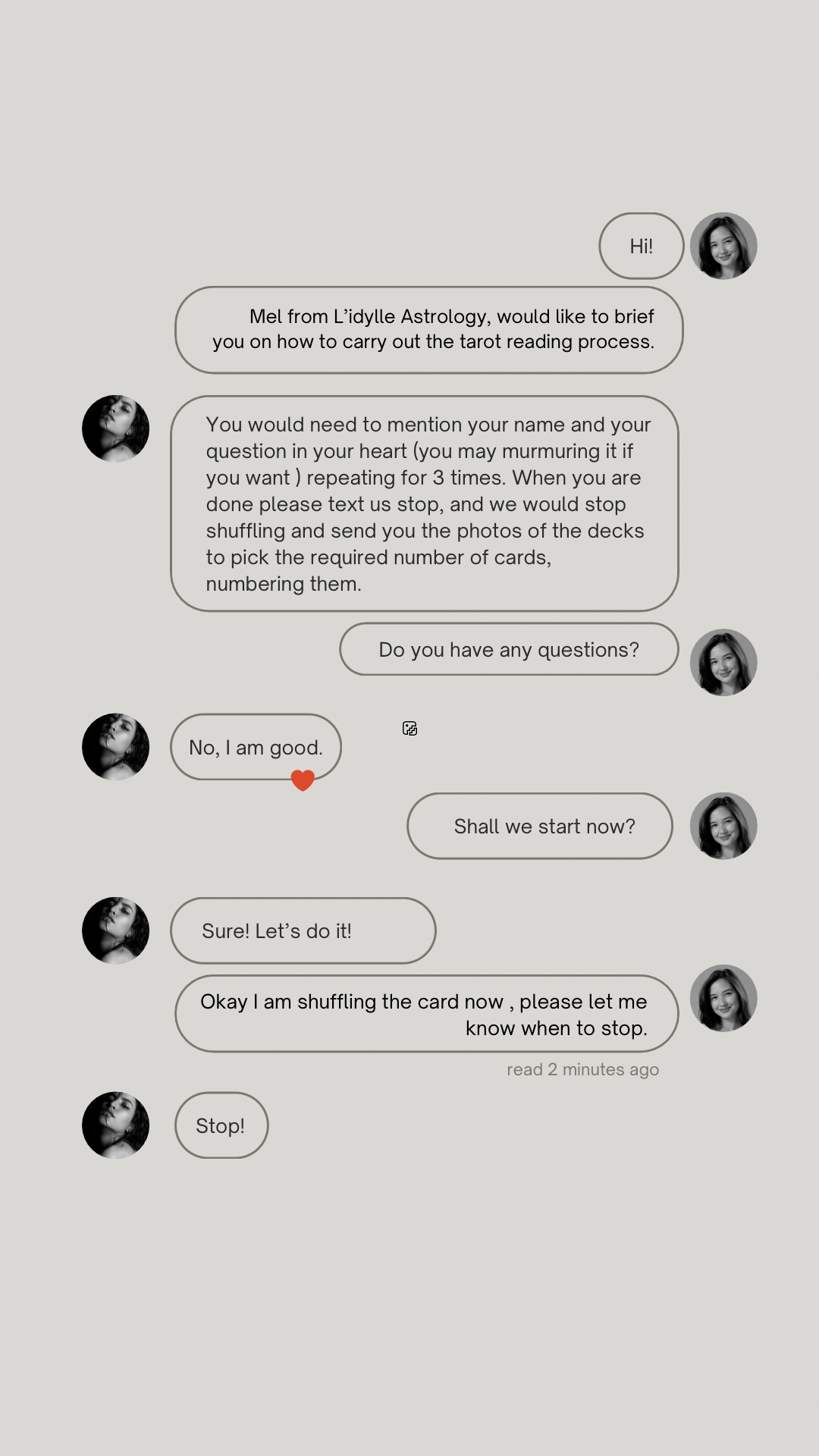 Mel will connect with you via WhatsApp. She’ll help you reframe and refine your question so the reading is clear and focused.