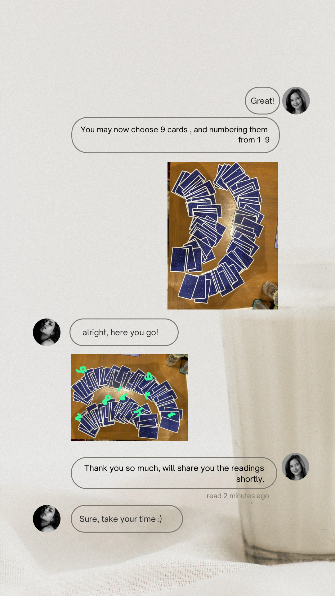 You’ll receive a picture of Tarot cards, choose your card and label it with number — Mel will then reveal its message and interpret how it relates to your situation.