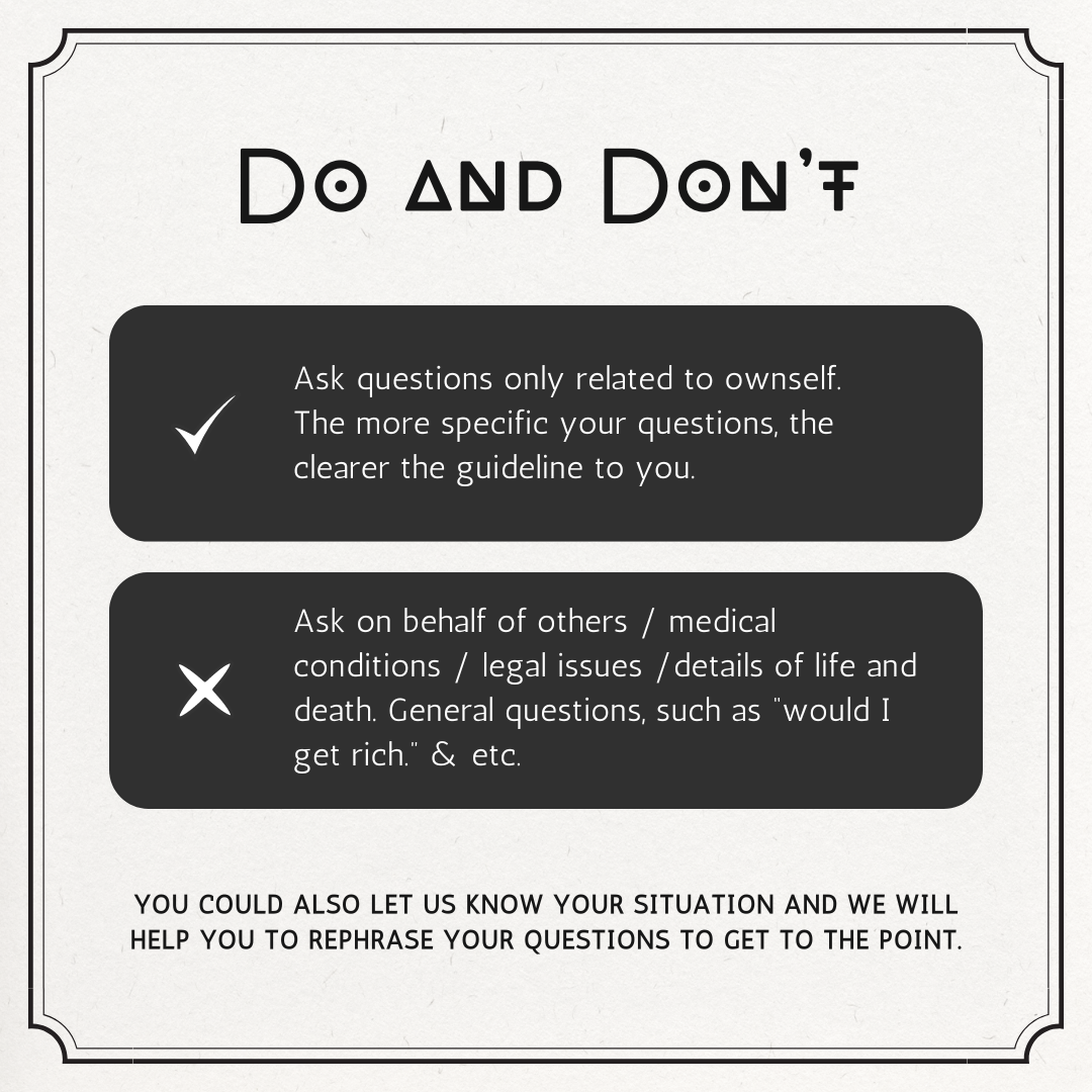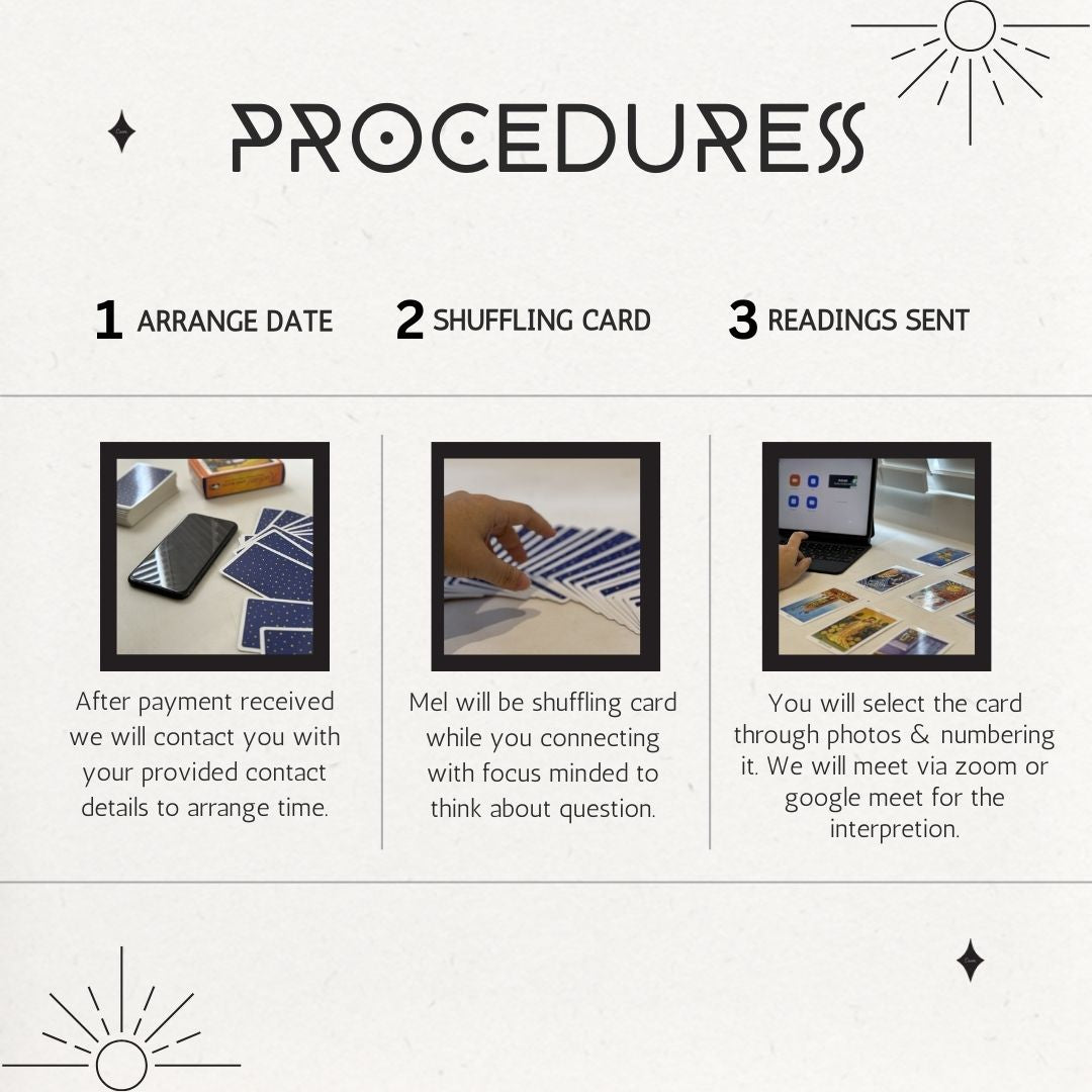 Once we received payment, we will contact you to understand your question and guide you on how to rephrase your question, as a specific and accurate question will help you to sort out the doubts that you wish to obtain a guide via Tarot, soon we find out your question, we will direct you the entire process and obtain your cards, and sending you the reading within 24 hours via Whatsapp or email.